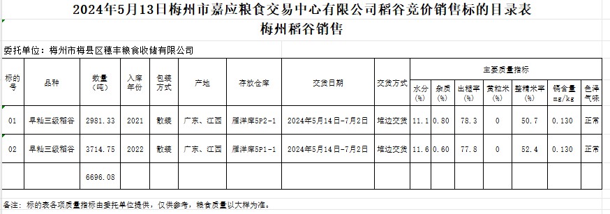 受客戶委托,梅州市嘉應(yīng)糧食交易中心有限公司定于2024年5月13日(星期一)舉辦糧食競價(jià)交易會(huì)。梅州市梅縣區(qū)穗豐糧食收儲(chǔ)有限公司擬銷售2021年、2022年產(chǎn)早秈稻6696.08噸。