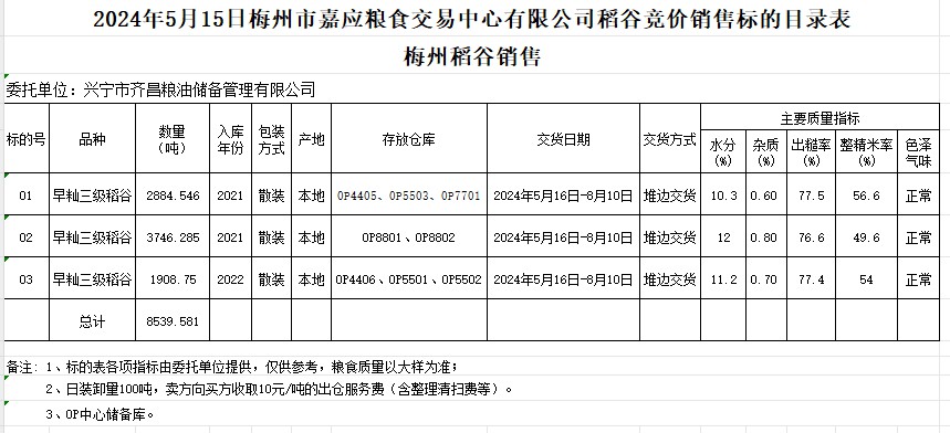 受客戶委托,梅州市嘉應(yīng)糧食交易中心有限公司定于2024年5月15日(星期三)舉辦糧食競價(jià)交易會(huì)。興寧市齊昌糧油儲(chǔ)備管理有限公司擬銷售2021年、2022年產(chǎn)早秈稻8539.581噸。