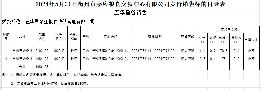 受客戶委托,梅州市嘉應(yīng)糧食交易中心有限公司定于2024年5月31日(星期五)舉辦糧食競價交易會。五華縣琴江糧油收儲管理有限公司擬銷售2022年產(chǎn)早秈稻4086.95噸。