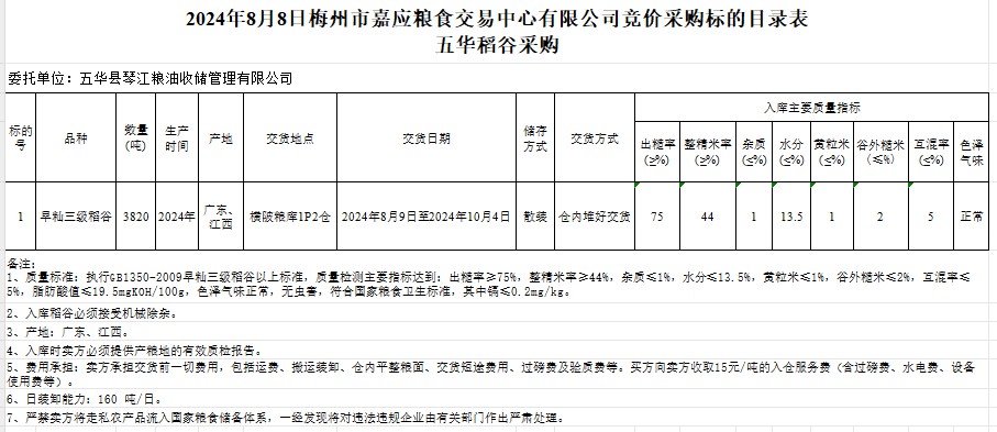 受客戶委托,梅州市嘉應(yīng)糧食交易中心有限公司定于2024年8月8日(星期四)舉辦糧食競價(jià)交易會。五華縣琴江糧油收儲管理有限公司擬采購2024年產(chǎn)早秈稻谷3820噸。