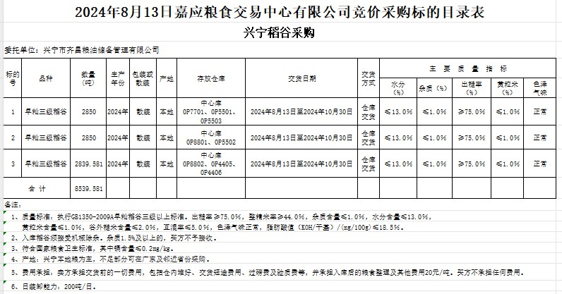 受客戶委托,梅州市嘉應(yīng)糧食交易中心有限公司定于2024年8月13日(星期二)舉辦糧食競(jìng)價(jià)交易會(huì)。興寧市齊昌糧油儲(chǔ)備管理有限公司擬采購2024年產(chǎn)早秈稻8539.581噸。