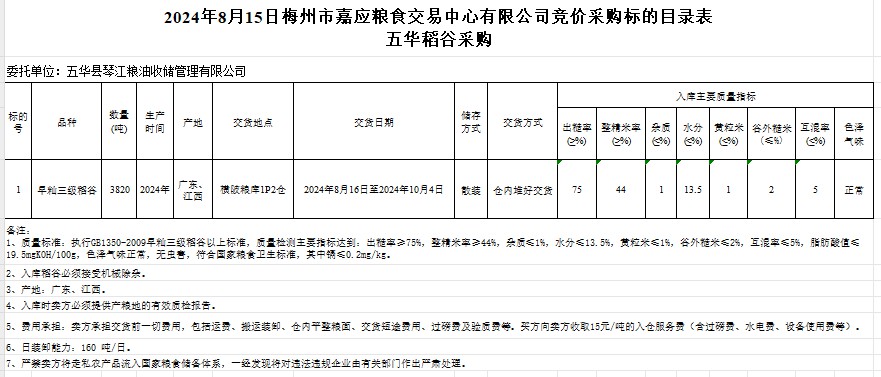 受客戶委托,梅州市嘉應(yīng)糧食交易中心有限公司定于2024年8月15日(星期四)舉辦糧食競價(jià)交易會(huì)。五華縣琴江糧油收儲管理有限公司擬采購2024年產(chǎn)早秈稻谷3820噸。