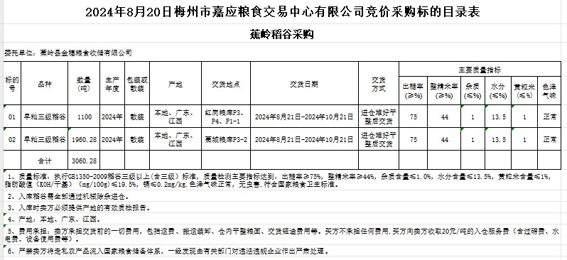 受客戶委托,梅州市嘉應(yīng)糧食交易中心有限公司定于2024年8月20日(星期二)舉辦糧食競(jìng)價(jià)交易會(huì)。蕉嶺縣金穗糧食收儲(chǔ)有限公司擬采購(gòu)2024年產(chǎn)早秈稻3060.28噸。