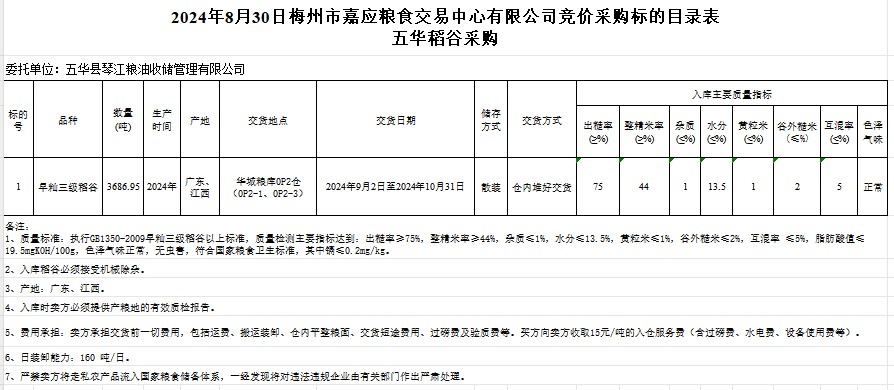 受客戶委托,梅州市嘉應糧食交易中心有限公司定于2024年8月30日(星期五)舉辦糧食競價交易會。五華縣琴江糧油收儲管理有限公司擬采購2024年產(chǎn)早秈稻谷3686.95噸。