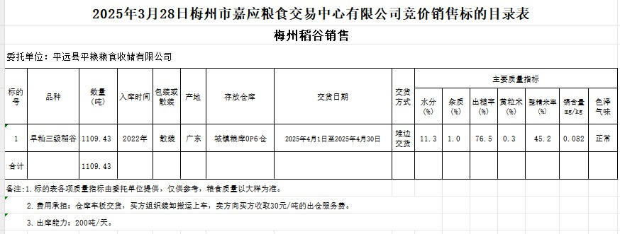 受客戶委托,梅州市嘉應糧食交易中心有限公司定于2025年3月28日(星期五)舉辦糧食競價交易會。平遠縣平糧糧食收儲有限公司擬銷售2022年產(chǎn)早秈稻1109.43噸。