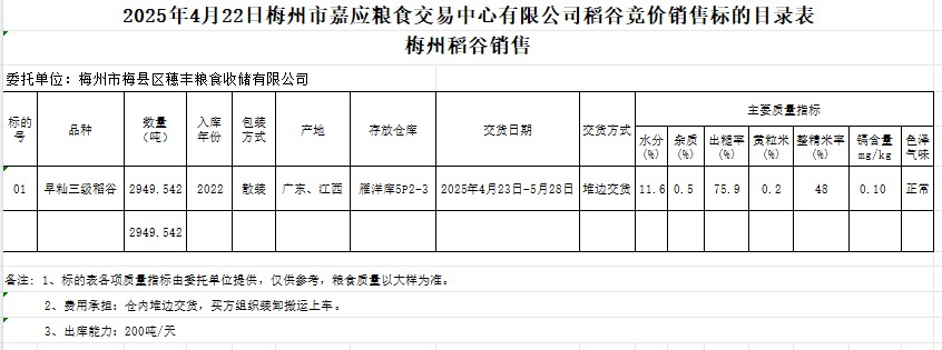 受客戶委托,梅州市嘉應糧食交易中心有限公司定于2025年4月22日(星期二)舉辦糧食競價交易會。梅州市梅縣區(qū)穗豐糧食收儲有限公司擬銷售2022年產(chǎn)早秈稻谷2949.542噸。