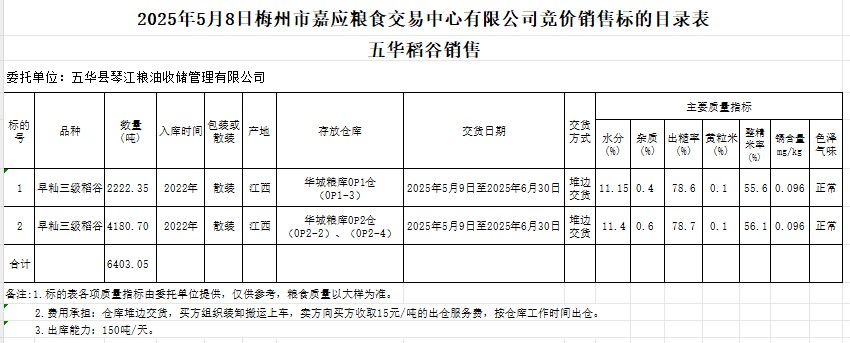 受客戶委托,梅州市嘉應(yīng)糧食交易中心有限公司定于2025年5月8日(星期四)舉辦糧食競價(jià)交易會。五華縣琴江糧油收儲管理有限公司擬銷售2022年產(chǎn)早秈稻谷6403.05噸。