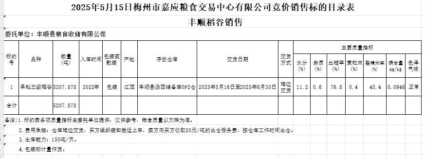受客戶委托,梅州市嘉應(yīng)糧食交易中心有限公司定于2025年5月15日(星期四)舉辦糧食競價交易會。豐順縣糧食收儲有限公司擬銷售2022年產(chǎn)早秈稻谷5207.878噸。