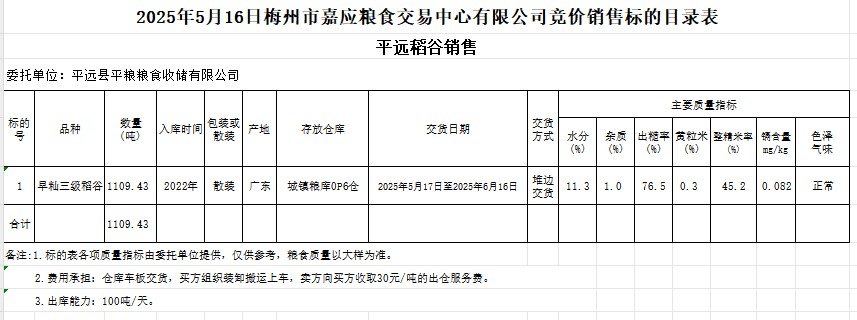 受客戶委托,梅州市嘉應(yīng)糧食交易中心有限公司定于2025年5月16日(星期五)舉辦糧食競價交易會。平遠(yuǎn)縣平糧糧食收儲有限公司擬銷售2022年產(chǎn)早秈稻谷1109.43噸。