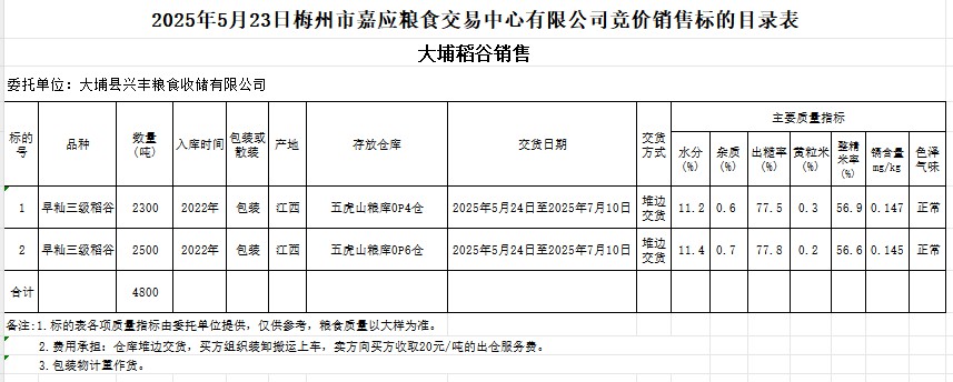 受客戶委托,梅州市嘉應糧食交易中心有限公司定于2025年5月23日(星期五)舉辦糧食競價交易會。大埔縣興豐糧食收儲有限公司擬銷售2022年產早秈稻谷4800噸。