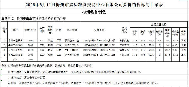 受客戶委托,梅州市嘉應糧食交易中心有限公司定于2025年6月11日(星期三)舉辦糧食競價交易會。梅州市嘉泰糧食和物資儲備有限公司擬銷售2022年產(chǎn)早秈稻谷7500噸。