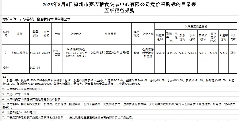 受客戶委托,梅州市嘉應(yīng)糧食交易中心有限公司定于2025年8月6日(星期三)舉辦糧食競價交易會。五華縣琴江糧油收儲管理有限公司擬采購2025年產(chǎn)早秈稻谷6403.05噸。