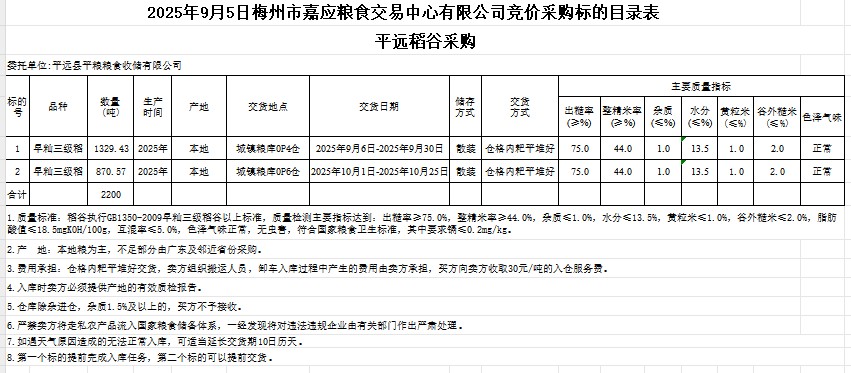 受客戶委托,梅州市嘉應糧食交易中心有限公司定于2025年9月5日(星期五)舉辦糧食競價交易會。平遠縣平糧糧食收儲有限公司擬采購2025年產早秈稻谷2200噸。