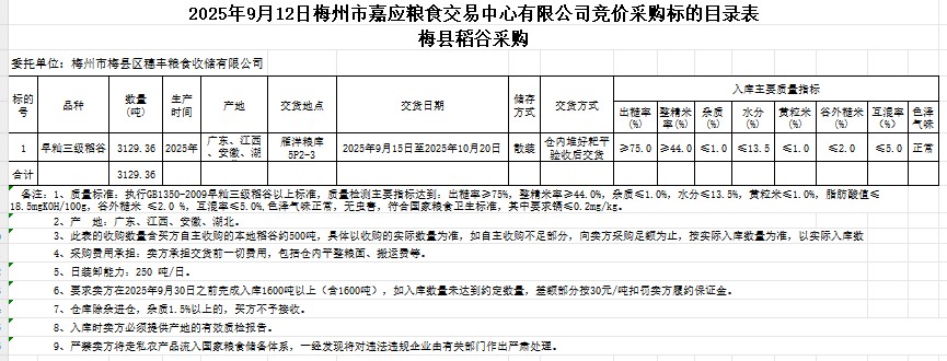 受客戶委托,梅州市嘉應(yīng)糧食交易中心有限公司定于2025年9月12日(星期五)舉辦糧食競(jìng)價(jià)交易會(huì)。梅州市梅縣區(qū)穗豐糧食收儲(chǔ)有限公司擬采購(gòu)2025年產(chǎn)早秈稻谷3129.36噸。