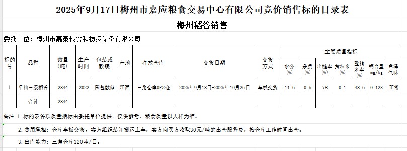 受客戶(hù)委托,梅州市嘉應(yīng)糧食交易中心有限公司定于2025年9月17日(星期三)舉辦糧食競(jìng)價(jià)交易會(huì)。梅州市嘉泰糧食和物資儲(chǔ)備有限公司擬銷(xiāo)售2022年產(chǎn)早秈稻谷2844噸。