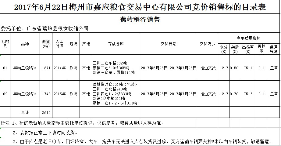 受客戶委托,梅州市嘉應(yīng)糧食交易中心有限公司定于2017年6月22日舉辦糧食競價(jià)交易會(huì),廣東省蕉嶺縣糧食收儲(chǔ)公司擬銷售2014、2015年早秈三級稻谷共3619噸。
