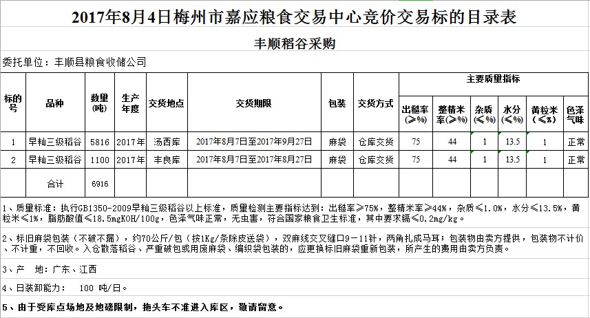 受客戶委托,梅州市嘉應(yīng)糧食交易中心有限公司定于2017年8月4日舉辦糧食競價交易會,豐順縣糧食收儲公司擬采購2017年早秈三級稻谷共6916噸。