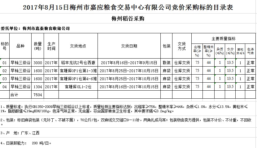 受客戶委托,梅州市嘉應(yīng)糧食交易中心有限公司定于2017年8月15日舉辦糧食競價交易會,梅州市嘉泰糧食收儲公司擬采購2017年早秈三級稻谷共7504噸。