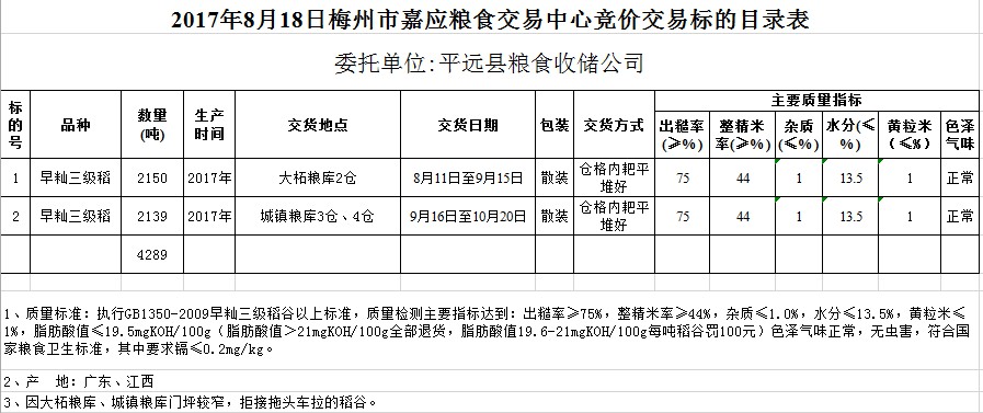 受客戶委托,梅州市嘉應(yīng)糧食交易中心有限公司定于2017年8月18日舉辦糧食競價交易會,平遠(yuǎn)縣糧食收儲公司擬采購2017年早秈三級稻谷共4289噸。