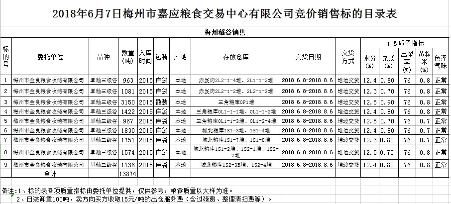 受客戶(hù)委托,梅州市嘉應(yīng)糧食交易中心有限公司定于2018年6月7日(星期四)舉辦糧食競(jìng)價(jià)交易會(huì),梅州市金良糧食收儲(chǔ)有限公司擬銷(xiāo)售早秈稻13874噸。