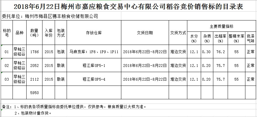 受客戶(hù)委托,梅州市嘉應(yīng)糧食交易中心有限公司定于2018年6月22日(星期五)舉辦糧食競(jìng)價(jià)交易會(huì),梅州市梅縣區(qū)穗豐糧食收儲(chǔ)有限公司5950噸。