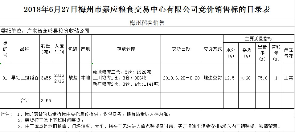 交易時間和地點:2018年6月27日(星期三)上午10時15分。廣東省梅州市彬芳大道南161號梅州市糧食交易中心3樓。