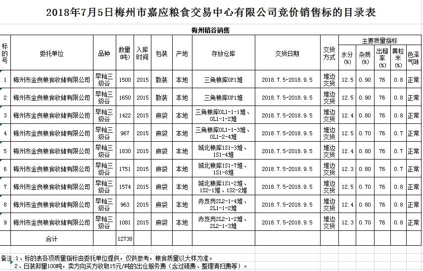 受客戶委托,梅州市嘉應(yīng)糧食交易中心有限公司定于2018年7月5日(星期四)舉辦糧食競價(jià)交易會,梅州市金良糧食收儲有限公司擬銷售早秈稻12738噸。