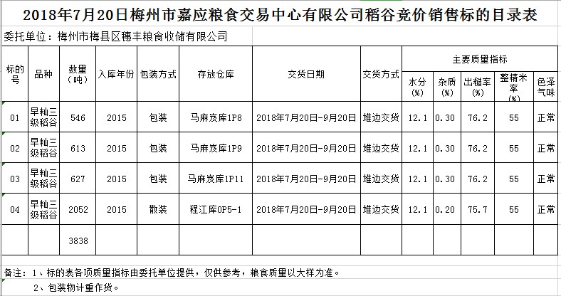 受客戶委托,梅州市嘉應(yīng)糧食交易中心有限公司定于2018年7月20日(星期五)舉辦糧食競(jìng)價(jià)交易會(huì),梅州市梅縣區(qū)穗豐糧食收儲(chǔ)有限公司擬銷售早秈稻3838噸。
