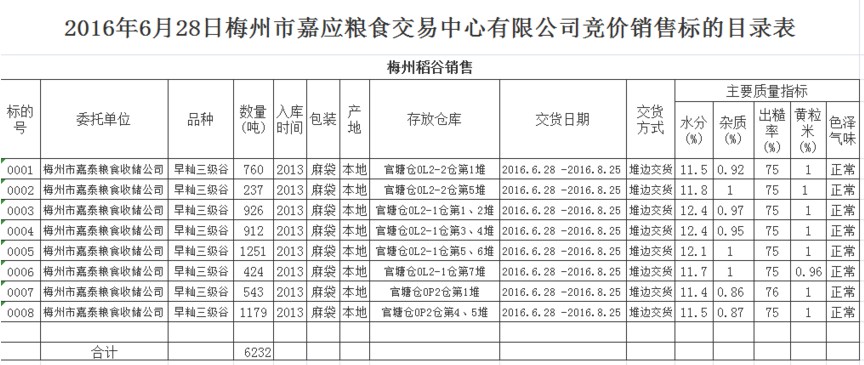 受客戶委托,梅州市嘉應(yīng)糧食交易中心有限公司定于2016年6月28日(星期二)舉辦糧食競(jìng)價(jià)交易會(huì),梅州市嘉泰糧食收儲(chǔ)公司擬銷(xiāo)售官塘倉(cāng)庫(kù)2013年早秈稻谷6232噸。