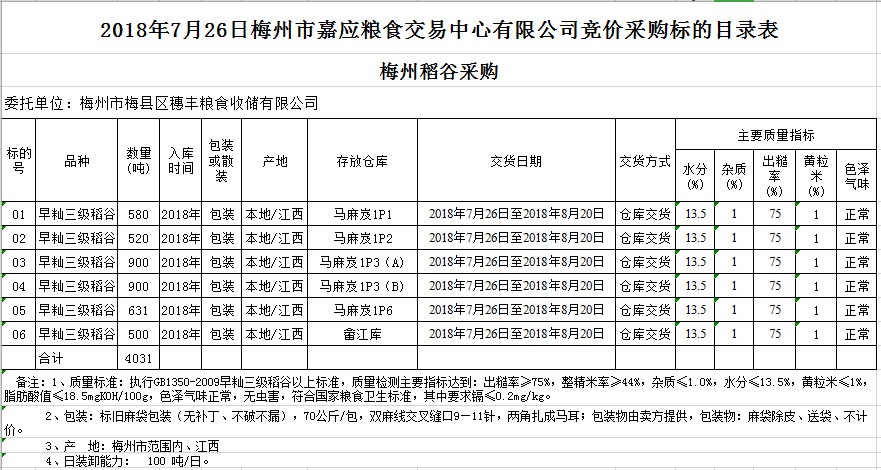 交易時間和地點(diǎn):2018年7月26日(星期四)上午10時。廣東省梅州市彬芳大道南161號梅州市糧食交易中心3樓。
